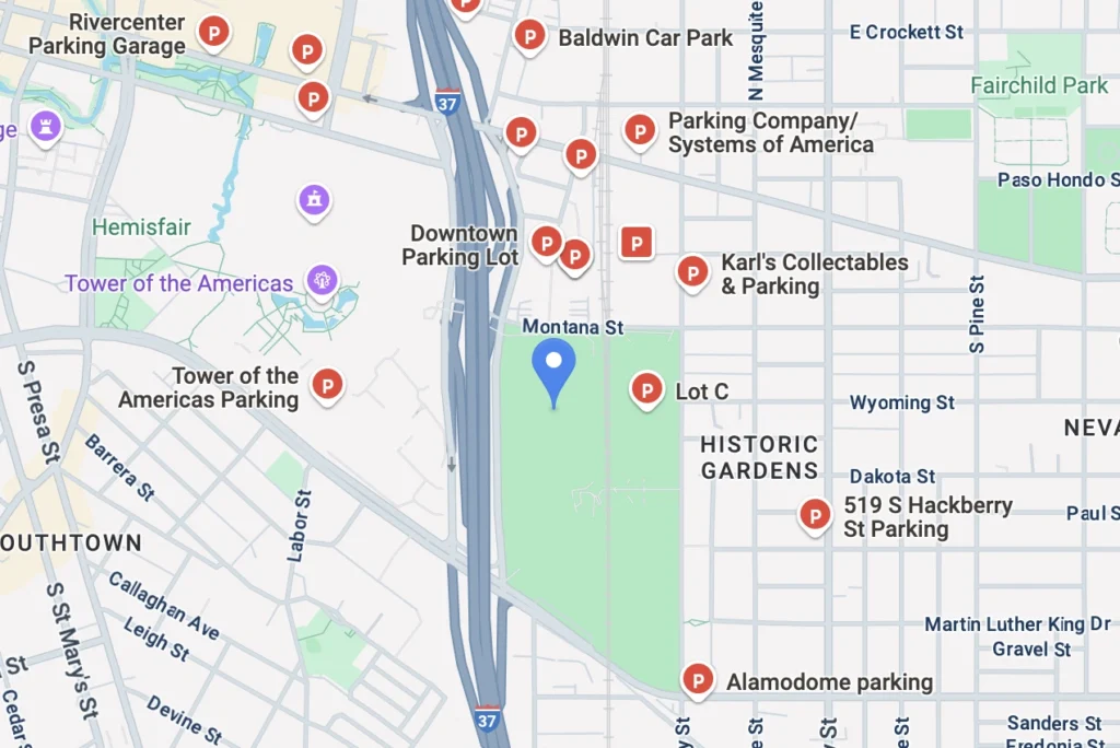 Use the New Braunfels Street exit, south on New Braunfels to Commerce Street, west on Commerce Street to Cherry Street, south on Cherry Street and into lots.